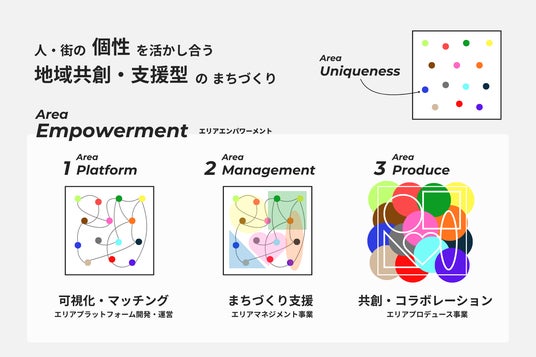 地域にすでに在る人や街の個性を可視化し、多様な個性を活かし合い、地域の新たな共創を生み出すことでエリア価値向上を図る「エリアエンパワーメント」の考え方を軸に、PIAZZAは3つの領域でまちづくりを実践しています。