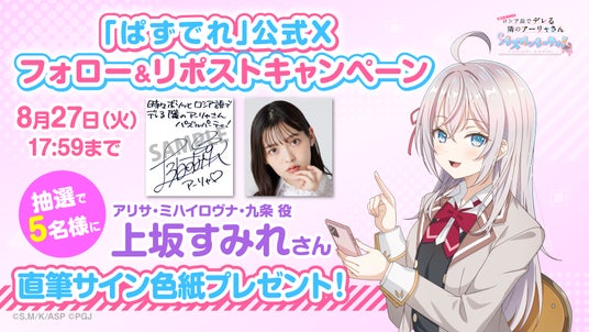 ポッピンゲームズジャパン株式会社(本社:東京都港区、代表取締役 CEO:谷口祐一郎)の開発する、TVアニメ「時々ボソッとロシア語でデレる隣のアーリャさん」初の新作スマートフォン向けアプリゲーム『時々ボソッとロシア語でデレる隣のアーリャさん パズルパーティ!』(略称:ぱずでれ)は、本日2024年8月21日(水)よりストア事前登録開始記念として7週間連続で出演声優直筆サイン色紙があたる、プレゼントキャンペーンを開催します。