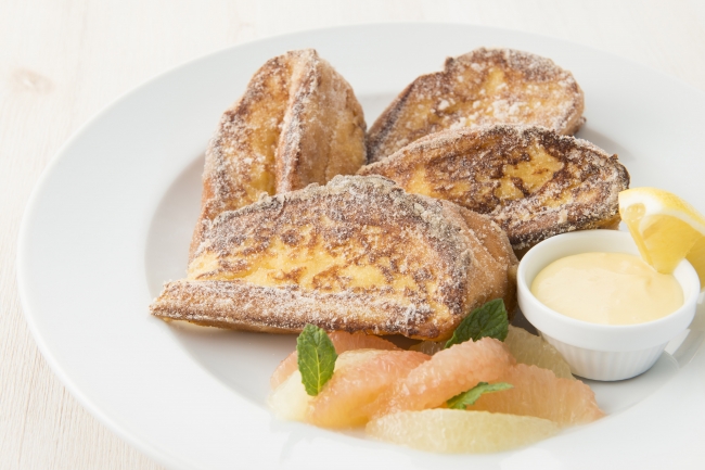 星型の搾り器から搾りだされた生地を油で揚げ、ハチミツ、砂糖、シナモンなどをまとわせたスペインの揚げ菓子“チュロス”。スペインでは朝食として食されています。そのチュロスをヒントに、フレンチトーストをアレンジした 『チュロフレンチ』 は、卵とバターが香るふわふわブレッドにアパレイユをさっと染み込ませ、たっぷりのバターで焼き上げた後、シナモンシュガ―をコーティングしたサラベス・オリジナルのスペシャルメニュー。そのままでももちろん美味ですが、添えたグレープフルーツやレモンカードをつけて食べると、爽やかな味が口に広がります。また、レモンを絞って召し上がると、さっぱりとした味わいに。春の暖かな陽射しを連想させるフレンチトーストです。