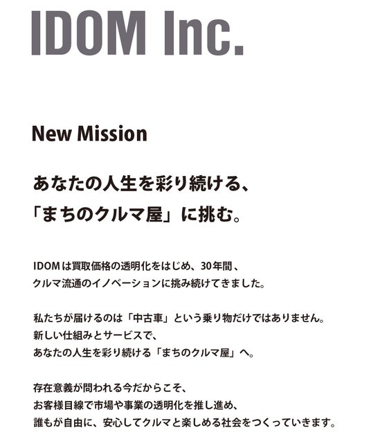 中古車大手の「ガリバー」を運営する株式会社IDOM(本社:東京都千代田区丸の内二丁目7-2 JPタワー26階、以下:IDOM)は2024年10月3日(木)に意思決定の指針となるミッションステートメント【あなたの人生を彩り続ける、「まちのクルマ屋」に挑む。】を発表いたします。