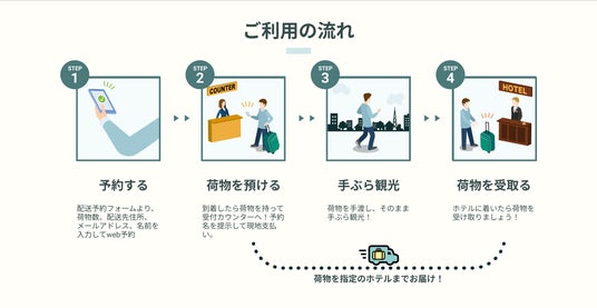 アプリ/webより導入店舗・施設を検索し、事前予約・決済でスムーズに荷物を預けることができます。手荷物だけでなく、コインロッカーに入らない大型の荷物(ベビーカー、楽器、スポーツ用品、折り畳み自転車など)の預かりも可能です。2024年8月より京急電鉄と連携し、羽田空港第3ターミナル駅にて「訪日外国人観光客向けの手荷物当日配送サービス」の実証実験を実施しています。