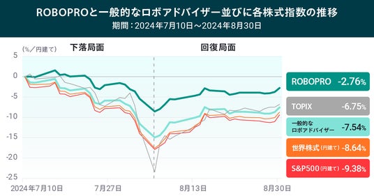 ※1 過去の実績は将来の運用成果等を示唆又は保証するものではありません。AI予測の好事例のみを示しており、市場動向等によっては上記のような運用ができない場合があります。※2 ROBOPRO運用実績について、表示している期間において、ROBOPROサービスに投資していた場合のパフォーマンスです。※3 「一般的なロボアドバイザー」の運用シミュレーションについて、「一般的なロボアドバイザー」とは、利用者がリスク許容度に応じて設けられている複数の運用コースの中から一つのコースを選択し、一般的な運用アルゴリズム(ノーベル賞を受賞した理論に基づき、金融機関において広く使われている平均分散法を採用。平均分散法における期待リターンはCAPMを用いて算出。)を用いて自動で運用を行う投資一任サービスのことを指します。本運用シミュレーションは、一般的な運用アルゴリズムでROBOPROと同じETFを運用したと仮定したシミュレーション結果です。リスク許容度はやや高めとし、5%~40%の保有比率制限を設けて最適ポートフォリオを算出しています。※4 ※2,3の計算について、運用手数料を年率1.1%(税込)徴収し、リバランスは最適ポートフォリオとの乖離がないように実施したと仮定し、分配金は投資の拠出金銭に自動的に組み入れ、リバランスにより再投資したと仮定して計算しています。分配金やリバランス時の譲渡益に係る税金は考慮していません。(2024年8月30日時点の円建て価格/同年7月10日時点の円建て価格)-1」で計算した騰落率を%表示しています。グラフ上で表示している割合は年率ではありません。※5 折れ線グラフについて、「ROBOPRO」「一般的なロボアドバイザー」「TOPIX」「S&P500」「世界株式(MSCI ACWI)」について、2024年7月10日を基準としてFOLIOにて計算し作成した円建ての推移を表示しています。各株式指数はBloombergが提供するデータを基にFOLIOにて計算し作成しています。信頼できると考えられる情報を用いて算出しておりますが、情報の正確性、完全性等について保証するものではありません。計算後の数値の小数第3位以下を切り捨てて表示しています。