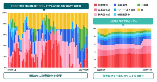 ※1 ROBOPROの投資配分の推移について各月に適用される投資配分の変更時点(ex.2024年10月は2024年9月30日時点)の比率を示しています。毎月の投資配分の変更とは別に、臨時で投資配分の変更を実施している場合があります。 ※2「一般的なロボアドバイザー」の投資配分シミュレーションについて:「一般的なロボアドバイザー」とは、利用者がリスク許容度に応じて設けられている複数の運用コースの中から一つのコースを選択し、一般的な運用アルゴリズム(ノーベル賞を受賞した理論に基づき、金融機関において広く使われている平均分散法を採用。平均分散法における期待リターンはCAPMを用いて算出)を用いて自動で運用を行う投資一任サービスのことを指します。本シミュレーションは、一般的な運用アルゴリズムでROBOPROと同じETFを運用したと仮定した結果です。リスク許容度はやや高めとし、5%~40%の保有比率制限を設けて最適ポートフォリオを算出しています。