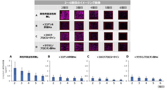 ヘアシャンプーやボディシャンプーなどの洗浄料に含まれるアニオン性界面活性剤は、洗浄力に優れ、特にアミノ酸系界面活性剤は低刺激性が期待されることから、敏感肌向け製品を中心に多用されています。アニオン性界面活性剤は洗浄力に優れる一方で、皮膚に吸着・浸透し、かゆみや刺激を引き起こす可能性があります。界面活性剤の種類や組み合わせによって皮膚への影響は異なることが報告されていますが、角層内での浸透や拡散の詳細な挙動は十分に解明されておらず、液体クロマトグラフィー質量分析法(LC/MS)などの定量的手法ではこれらを直接「可視化」することが困難でした。