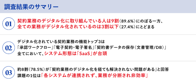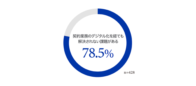 その結果、9割近く(89.6%)が契約業務のデジタル化に取り組む一方、全ての契約業務がデジタル化されているのは3割以下(27.4%)にとどまることがわかりました。 また、約8割(78.5%)がデジタル化を経ても解決されない課題があると感じている現状も浮き彫りになりました。