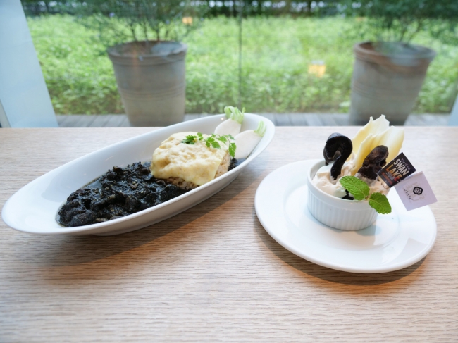 白鳥の「白」をチーズとかぶで、全身を黒で包んだ男・ストレンジャーの「黒」を牛肉と黒ごまのカレーで表現。小麦粉不使用。