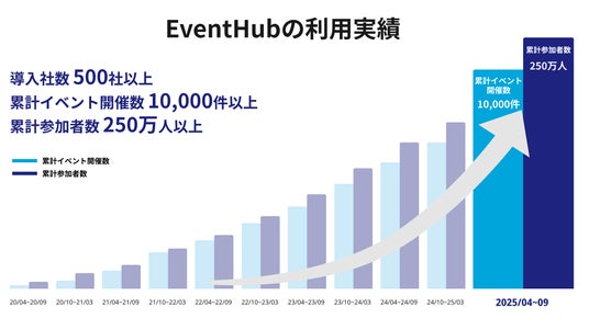 「EventHub」の利用実績は、「累計イベント開催数」「累計参加者数」「導入企業数」のすべてにおいて大きく成長し、2025年9月時点で以下の実績となりました。