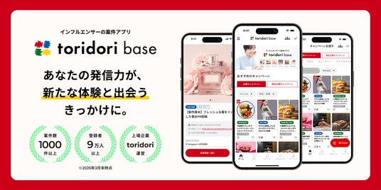 インフルエンサーマーケティングプラットフォーム『toridori marketing/toridori base(トリドリマーケティング/トリドリベース)』を中心としたインフルエンサーマーケティング事業を手がける株式会社トリドリ(本社:東京都渋谷区、代表取締役社長CEO:中山貴之、証券コード:9337、以下toridori)は、インフルエンサー向け案件管理サービス『toridori base(トリドリベース)』の登録ユーザーが9万人を突破したことをお知らせいたします。