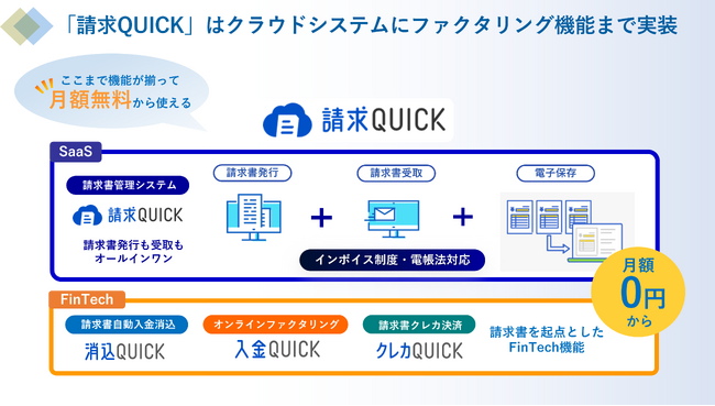 「請求QUICK」は、法制度対応と業務効率化を実現するクラウド型請求書管理システム(SaaS)をベースに3つのFinTech機能が組み込まれており、月額無料からご利用いただくことができます。金融機関とのAPI連携による自動明細取得機能で面倒な入出金の消込作業を大幅に効率化する「消込QUICK」、発行した請求書をクレジットカードでオンライン決済できる「クレカQUICK」、発行した請求書をWeb完結で資金化できるオンラインファクタリング「入金QUICK」という3つのFinTech機能を、すべて1つのシステムで提供しています。