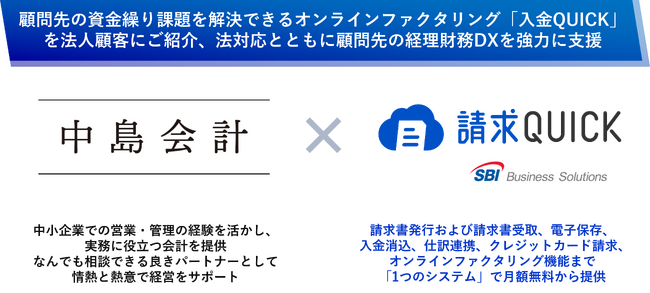 このような課題に対し、当社は多様化する中小企業経営者の課題解決ノウハウを豊富に持つ中島会計と提携し、顧問先である法人顧客向けに、初期費用・月額費用0円から始められてインボイス制度・改正電帳法対応が可能なクラウド型請求書管理システム「請求QUICK」の導入を相互協力のもと推進することといたしました。