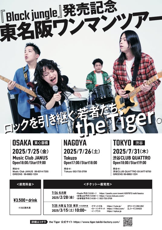 バンドの確かな演奏力と、ヴォーカル・りんの天性の歌唱力で注目を集める4人組ロック・バンド、the Tiger(ザ・タイガー)。デビューアルバム「Get Ready」のアナログ化に続き、2025年4月23日にリリースされたセカンドアルバム「Black jungle」(EDCE-1048/発売元:JUST LUCK RECORDS/EDOYA CORPORATION)が、早くもアナログリリース決定!