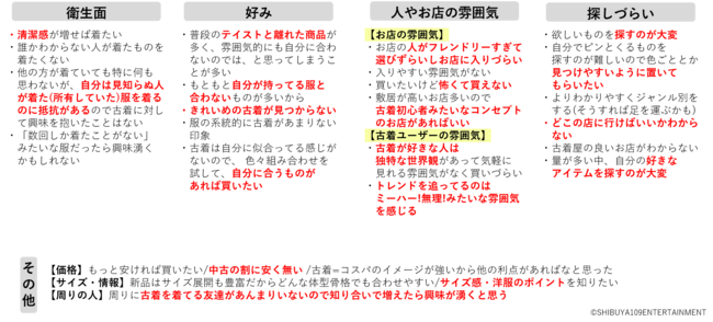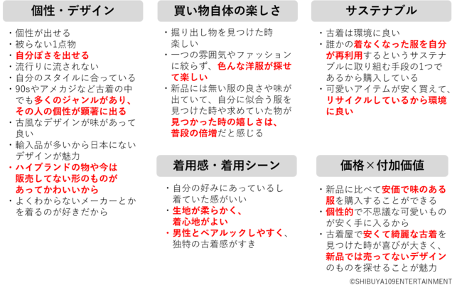 一方で、古着ユーザーのSHIBUYA109 lab. EYEZメンバーからは「古着屋は内装が可愛いことも多い。購入しなくても楽しい場所として知ってもらい、フラッと立ち寄ってほしい」といった声もありました。