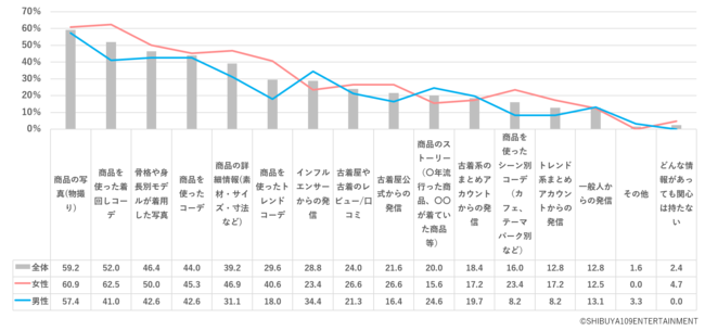 また、古着の関心度が高まる情報※図3について聞いたところ、「商品の写真(59.2%)」が高く、「商品を使った着回しコーデ(52.0%)」「商品を使ったコーデ(44.0%)」「商品を使ったトレンドコーデ(29.6%)」などのコーデに関する情報を求める声も多く聞かれました。特に、女性からは「商品を使ったシーン別コーデ(23.4%)」などコーデ情報の要望が多く、一方男性からは、「インフルエンサーからの発信(34.4%)」といった発信者に対する言及や「商品のストーリー(24.6%)」といった古着ならではの商品の詳細情報を求める声が挙がりました。