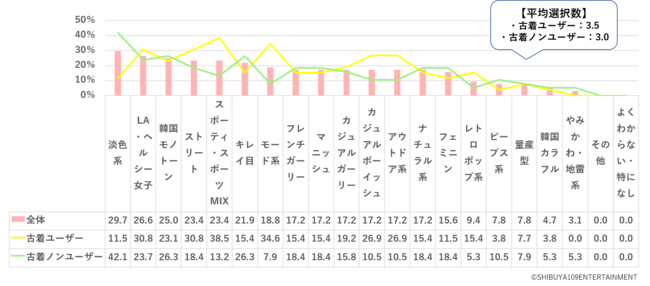 SHIBUYA109 lab. EYEZメンバーからは「古着ファッションを楽しむインフルエンサーの影響で、古着を楽しむ人も増えた印象がある」「古着=ストリート系のような、特定のジャンルをイメージする人が多いと思うが、実際は流行りの淡色系のコーデも古着で楽しめるので、ファッションジャンルに縛られない古着の楽しみ方を伝えたい」といった声が聞かれました。SHIBUYA109 lab.のこれまでの調査では、Z世代は遊ぶ場所や人に合わせてファッションテイストを使い分けている傾向が確認されており、様々なファッションテイストが古着を取り入れながら楽しめることを訴求することで、古着の間口を広げられることが考えられます。