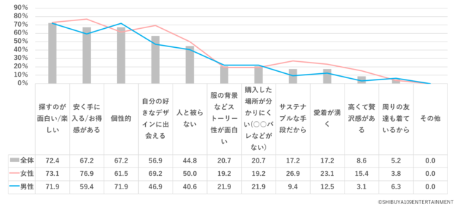 男女別で見ると、男性は「個性的(71.9%)」「探すのが面白い/楽しい(71.9%)」の数値が特に高い一方で、女性は各項目の数値が高く、様々な魅力を感じて古着を利用していることがうかがえました。
