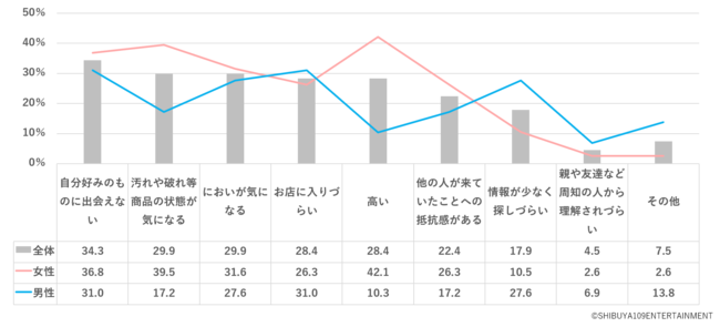 男性の場合は「自分好みのものに出会えない(31.0%)」と「お店に入りづらい(31.0%)」が同率1位、次いで「情報が少なく探しづらい(27.6%)」となり、お店の入りづらさや情報の少なさが主なハードルとなっていることがわかります。
