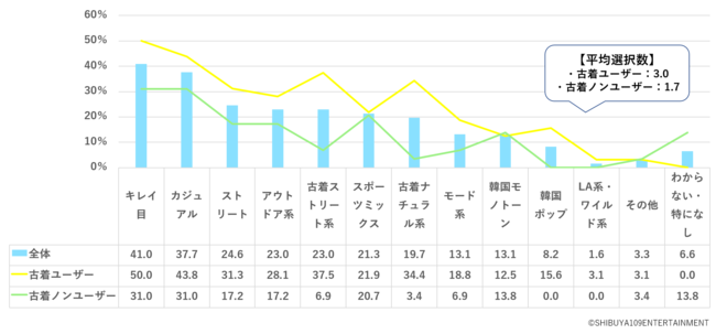 男性の場合※図1、古着ユーザーも古着ノンユーザーも「キレイ目」「カジュアル」がTOP2となりましたが、古着ユーザーは平均3.0個のファッションジャンルを選択する一方で、古着ノンユーザーは平均1.7個選択しており、古着ユーザーはより多くのファッションジャンルを楽しむ中で、「古着」も楽しんでいることがわかりました。
