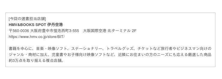今回のキュレーター:HMV&BOOKS SPOT 伊丹空港 柴田 健太郎