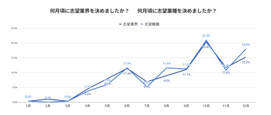 「志望業界/職種を決めた時期」について尋ねたところ、業界・業種ともに2023年6月(11.6%/11.4%)、2023年10月(20.4%/21.0%)がピークであることがわかりました。いずれも夏・冬インターン実施前のタイミングであることから、インターンに関する広報が業界・職種の選択に影響を及ぼしていることがうかがえます。