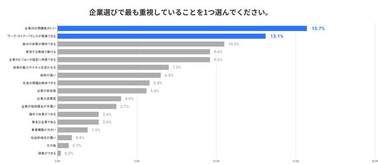「企業選びで最も重視すること」に関する質問では、「企業内の雰囲気がいい」(15.7%)が最も多く、次いで「ワーク・ライフ・バランス」(13.1%)が続きました。入社する企業を選択する時期に差し掛かり、入社後の姿をイメージする上で「一緒に働く人の雰囲気」や「私生活との両立が可能か」を見極めていることがうかがえます。