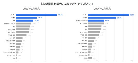 志望業界に関して、2023年7月と2024年2月に同様の質問をしたところ、いずれも「メーカー」「IT・通信」「金融」「コンサル・シンクタンク」が上位を占めました。時期による大きな変動がないことから、志望業界は一度決めるとその後大きく変化することがないと推察されます。