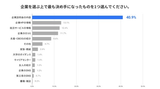 「企業を選ぶ上で最も決め手になったもの」に関する質問では、「企業説明会の内容」(40.9%)が最多の結果となりました。就職活動において、学生が企業を目にする最初の機会が企業説明会であることからも、企業説明会の内容や雰囲気が学生の企業選択に大きな影響を与えていることが明らかになりました。