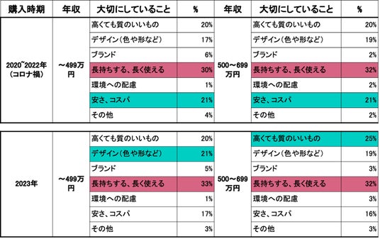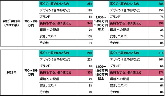 コロナ禍・コロナ後で家具・家電を購入した人たちが家具を選ぶ際に一番大切にしていること年収別に見てみると、どの年収を見ても「長持ちする、長く使える」が一番大切な要素であることがわかりました。しかしコロナ禍では、年収が500万円~699万円の人は「安さ、コスパ」を2番目に大切にすると回答しているのに対し、コロナ後(2023年)は、「高くても質のいいもの」が大切にされていることがわかりました。年収が700万円以上の世帯は、コロナ禍、コロナ後に関わらず、「高くても質のいいもの」を2番目に選んでおり、年収が上がるごとにその割合も増えています。