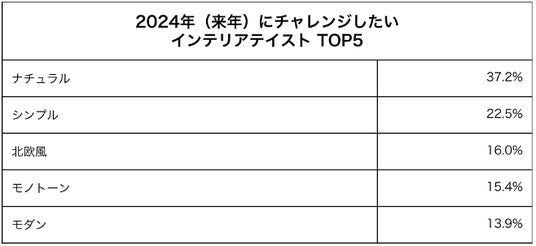 - 2024年にチャレンジしたいインテリアテイストは「ナチュラル」が37.2%で一位。