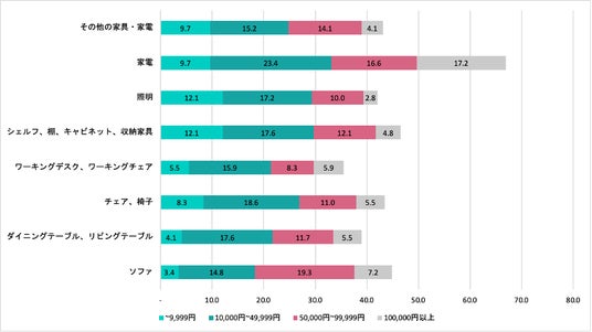 - 全体的に家具は、10,000円~50,000円以内の物が人気な傾向。ソファの価格はもう少し上がり、50,000円~100,000円以内の方が人気。家電は、10,000円~50,000円以内が人気でありつつも100,000円以上の物を買う人も多くみられる結果に。