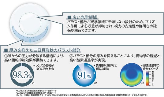 当商品は、“高い酸素透過率(Dk/L値=175※2)”を実現するシリコーンハイドロゲルレンズです。特殊な網目構造とダブルの保湿成分配合でレンズ表面にうるおいをしっかりキープいたします。また、乱視用レンズのデザインとして、ステーブルトーリックデザインを採用し、クリアで安定した視界と快適な装用感を目指しました。