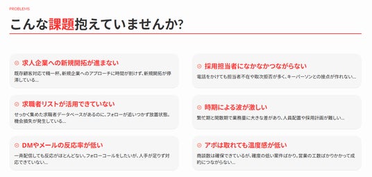 求人企業への新規アプローチが進まない、DMやメール施策の反応が伸びない、採用担当者・決裁者になかなかつながらないといった課題は、人材業界の営業現場で多く見られます。