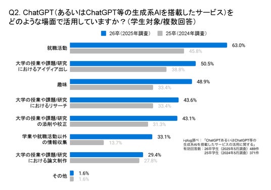ChatGPT等の活用場面について、「就職活動」が最多の63.0%。次いで、「大学の授業や課題/研究におけるアイディア出し」が50.5%でした。また、昨年5月に実施した25卒学生の調査と比較して、すべての項目の活用率が高くなっていることがわかります。