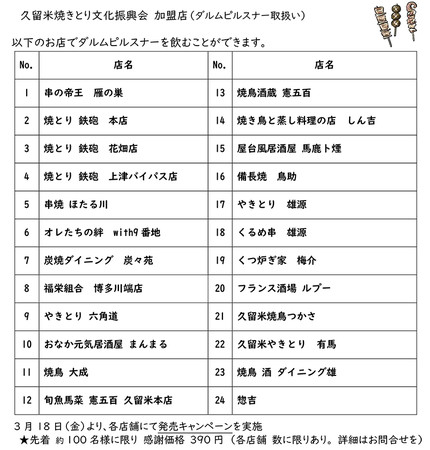 3月18日、ダルムピルスナーを発売開始します。スッキリしたのどごしと、低温発酵・長期間熟成されたクリアな味わいが特徴。久留米焼きとり文化振興会加盟店24店舗で飲むことができます。アツアツのダルムと一緒に、ぜひお楽しみください。