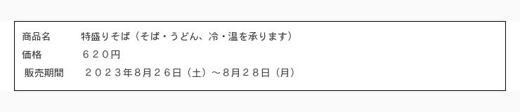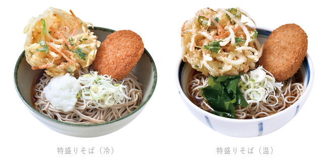 8月26日(土)~28日(月)の3日間はオープニングキャンペーンとして、人気のツートップであるかき揚げ天とコロッケ(カレー味)をトッピングし、麺を1.5玉に増量した『特盛りそば』を620円で販売いたします。箱根そばを代表する味を一度にご賞味いただけますので、是非この機会にご利用ください。