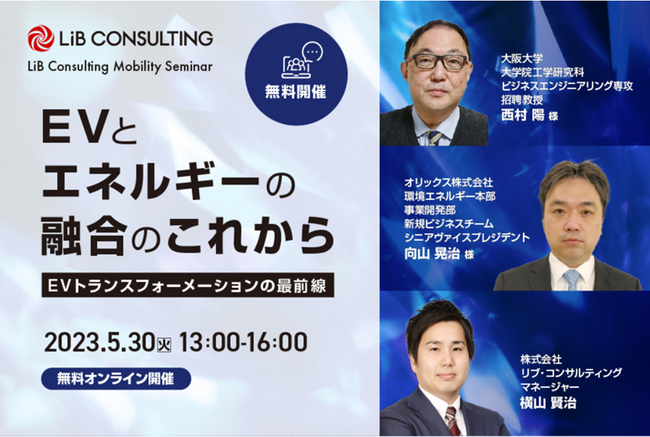 モビリティ業界に対するコンサルティング支援に強みを持つ株式会社リブ・コンサルティング(本社:東京都千代田区、代表取締役:関厳、以下「当社」)は、大阪大学大学院工学研究科とオリックス株式会社の豪華ゲストを交えて、産学共同セミナー「EVとエネルギーの融合のこれから」を開催することをお知らせします。