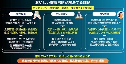 AI献立・栄養管理アプリ『おいしい健康』を運営する株式会社おいしい健康(代表取締役CEO:野尻哲也)は、製薬・医療機器企業向けのSaaS型患者支援プログラム「Patient Success Program(PSP)」の提供を開始しました。