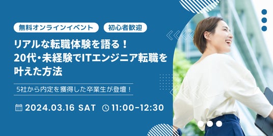 プログラミングスクール「SAMURAI ENGINEER(侍エンジニア)」を運営する株式会社SAMURAIは、無料オンラインイベント「リアルな転職体験を語る!20代・未経験でITエンジニア転職を叶えた方法」を、3月16日(土)11時より開催します。