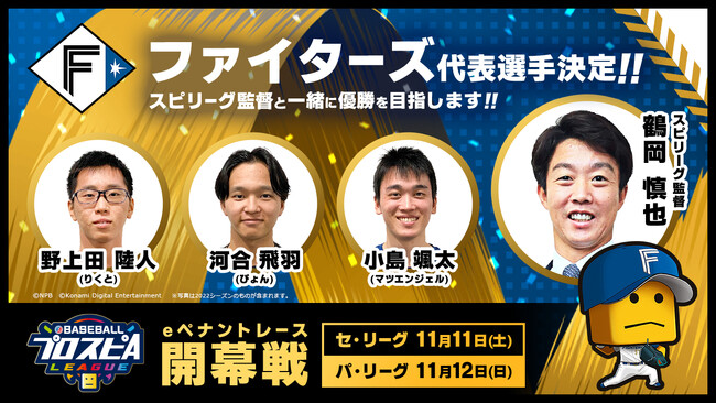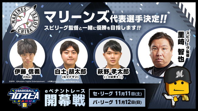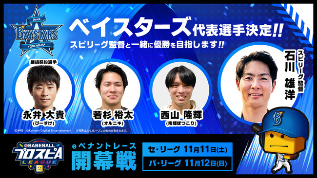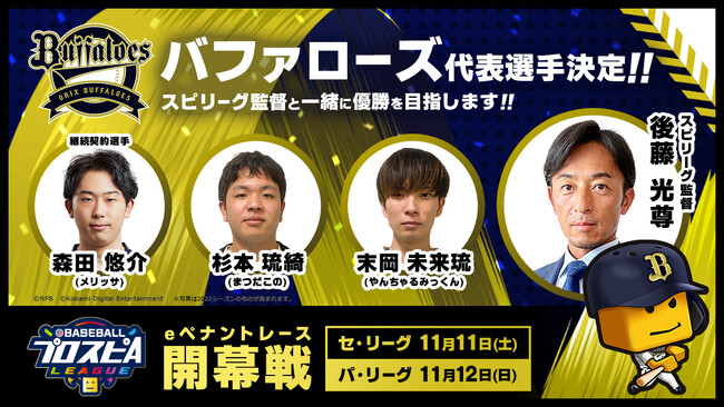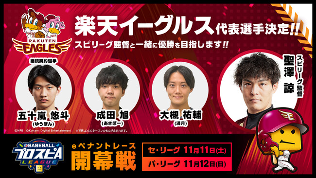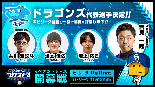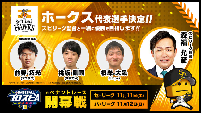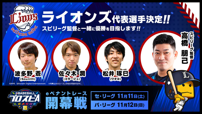 一般社団法人日本野球機構(NPB)と株式会社コナミデジタルエンタテインメントは、プロ野球eスポーツリーグ「eBASEBALLプロスピAリーグ」(スピリーグ)2023シーズンを戦う、12球団の代表選手が決定したことをお知らせします。