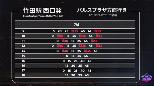 IVS2024 KYOTO / IVS Crypto 2024 KYOTOの会場である京都パルスプラザの最寄り駅は、地下鉄・近鉄 竹田駅となります。会期中、公共交通機関とは別に、竹田駅より京都パルスプラザを行き来するシャトルバスを9:30から19:25まで(7月4日は19:30まで)運行予定です。ぜひご利用ください。なお、こちらのシャトルバスは、BUSINESS Pass群 (Startup / Investor / Executive / Speaker) を持っている皆さまの優先乗車となります。