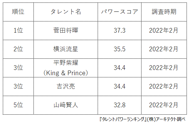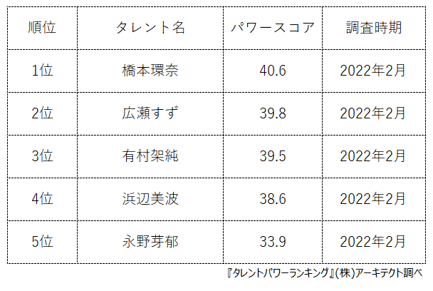 本ランキングは、2022年2月度に実施したタレント調査データ(一部過去実施データ)を利用し、タイトルに応じてランキング形式でまとめたものです。