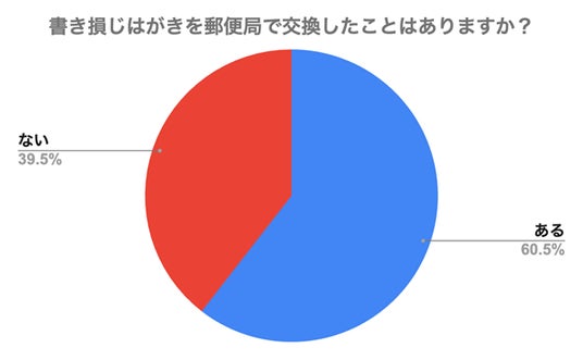 書き損じはがきの交換経験を尋ねたところ、「ある」が60.5%、「ない」が39.5%という結果に。