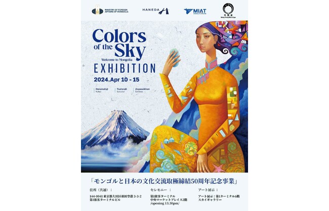 日本空港ビルデング株式会社と駐日モンゴル国大使館は、日本とモンゴル国間の文化交流50周年を記念して、4月10日(水)から15日(月)までの6日間、第1ターミナル6階スカイギャラリーにて「Colors of the Sky Welcome to Mongolia展」を開催いたします。