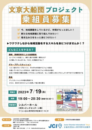 公益社団法人東京青年会議所 文京区委員会では、7月19日(月)19:00~20:30に、文京シビックセンター4階のシルバーホールにて、文京大船団プロジェクトを開催します。