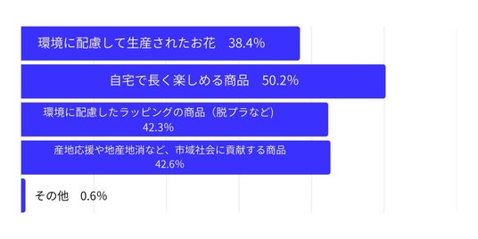 「母の日に、サステナブルな要素があるもの(環境・社会に配慮したもの)を贈りたいと思いますか?」という質問に対して、贈る人で6割以上、もらう人で約7割が「はい」と回答しました。消費者の環境意識が高まると同時に「1日でも長く美しさが続くこと」こそがサステナブルであると考える層が増えています。物価高の影響もあり、「すぐに枯らさず、長く愛でる」ことが、廃棄抑制(環境負荷軽減)と心の豊かさを両立させる実利的なエシカル消費として捉えられています。
