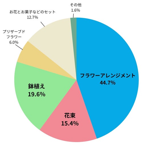 フラワーギフトの形態では、贈る側・もらう側双方でアレンジメントが圧倒的な支持を得ています。かつてギフトの主流だった花束を大きく引き離し、花器に生けられた状態のアレンジメントが人気です。