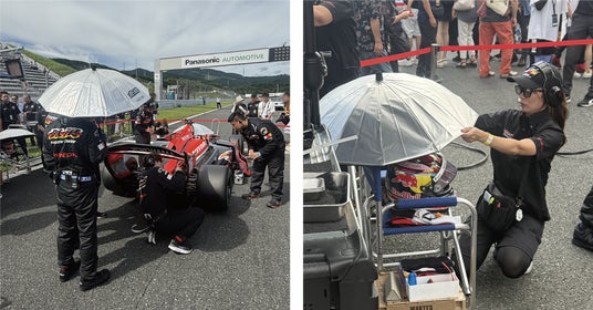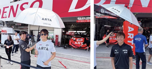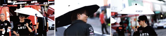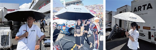 近年の夏場の急激な気温上昇により、レースの運営は過酷さを極めています。特に今年は5月から猛暑日の中でのレース展開となり、路面温度は60℃近くにも達しています。ドライバー、メカニックは太陽光の直射のみならず、路面からの強い輻射熱にさらされる事になり、熱中症リスクが極めて高い環境下で長時間過ごさざるを得ない状況です。そのような過酷な状況を少しでも緩和することを目的にARTAでは、2025年8月22日から24日まで開催された「SUPER GT 第5戦 鈴鹿大会」で、優れた冷却性能を持つSPACECOOL素材を活用した日傘を導入することに至りました。