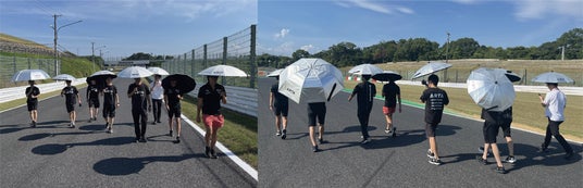 ドライバー、メカニック全員でSPACECOOL製日傘を差してコースを一周