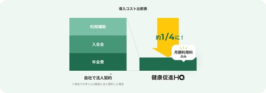 - 自社で大手ジムと法人契約する場合は、企業として入会金や年会費の支払いが発生しますが、「健康促進HQ」は月額利用料のみでご利用いただけるため、企業のコストを約1/4に削減します。