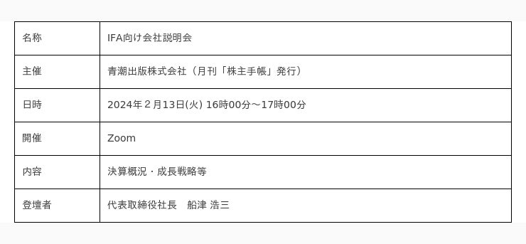 当社(本社:東京都千代田区、代表取締役社長 船津 浩三)は、IFA(独立系ファイナンシャルアドバイザー)の皆様を対象とした会社説明会を下記の通り開催いたします。