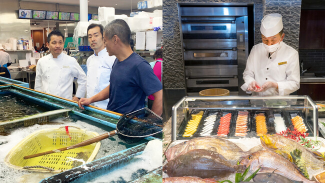今回、富山の魚をバイキングに使用するにあたり、ホテルグランヴィア京都の総料理長、カフェレストラン「ル・タン」シェフの2名が現地へ視察に行き吟味した食材を採用。寿司ネタとしては珍しい魚シイラをはじめ、視察で出会ったカンパチ、アジ、カツオなど、富山で鮮魚を扱う「黒崎屋※1.」から届くネタや、富山県で栽培され、プリプリの食感とキノコ特有の香りが味わえる「はなびら茸」などのネタが日替わりで握り寿司コーナーに登場します。その日おススメのネタが届くので、どのネタが登場するかは当日のお楽しみ!